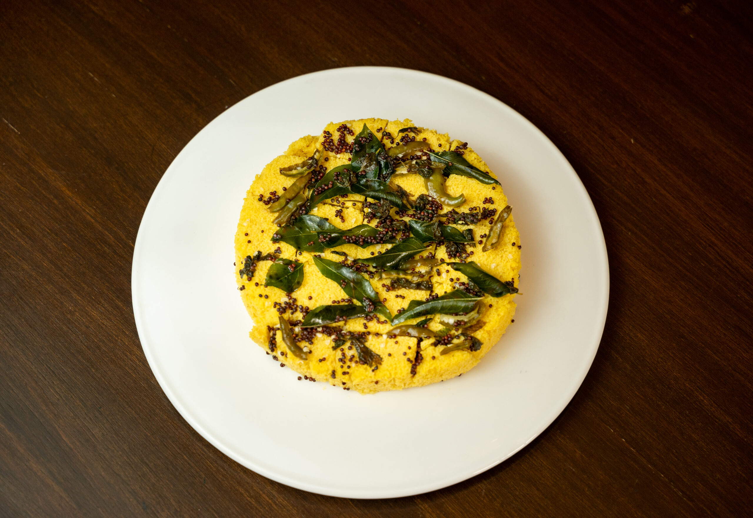 6. Sprinkle the syrup from the pot over the Dhokla dish.